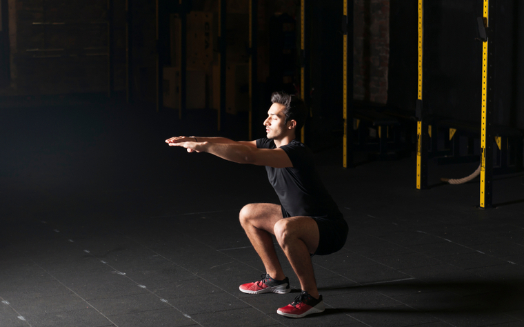 ✅ Desça como se fosse sentar em uma cadeira, mantendo o peito erguido.